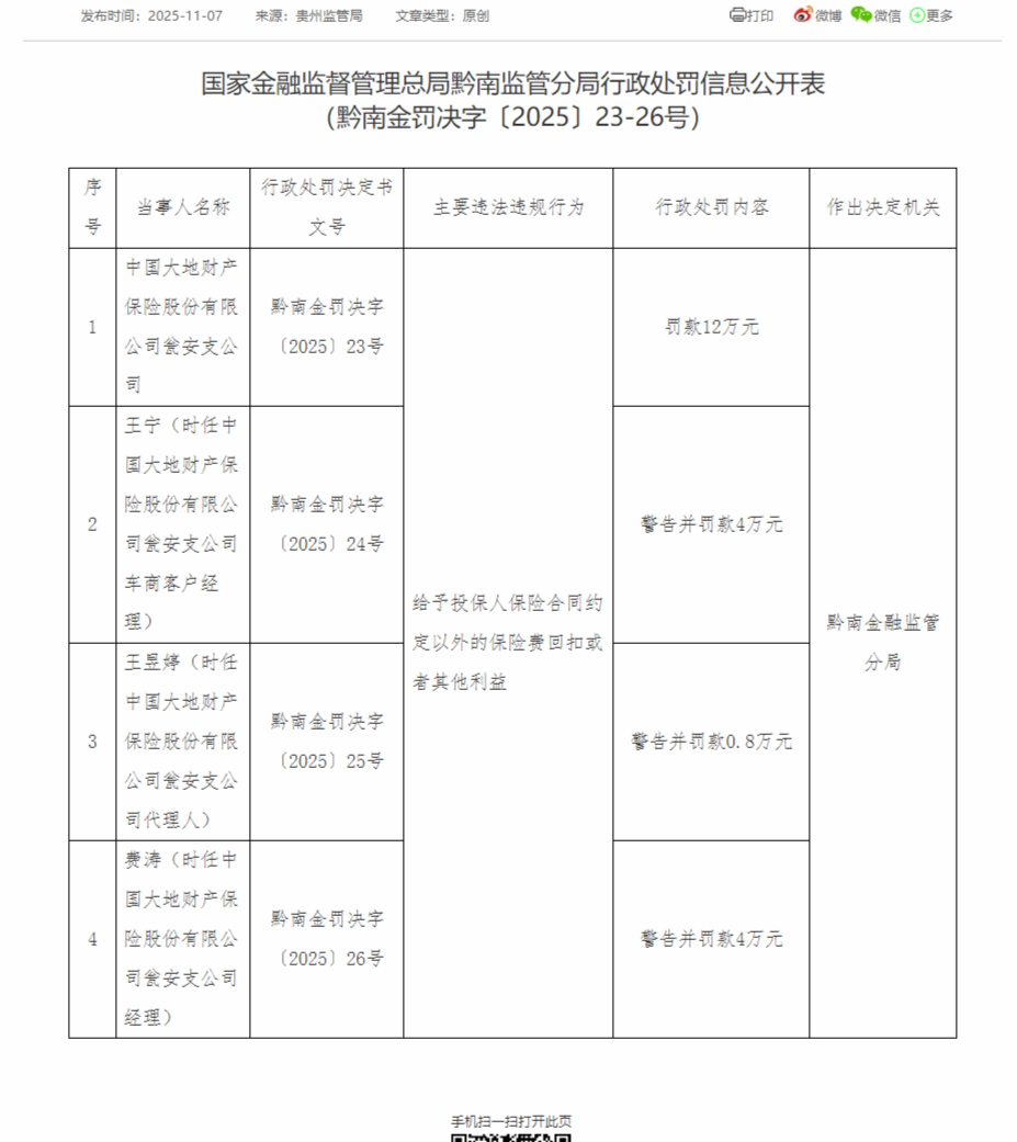 11月7日,国家金融监督管理总局黔南监管局行政处罚信息公示表(黔南金深决字[2025]号)王宁(时任中国大地财产保险股份有限公司瓮安分公司汽车经销商客户经理)、王玉婷(时任中国大地财产保险股份有限公司瓮安分公司代理人)、费陶(中国大地财产保险股份有限公司瓮安分公司经理) 元、8000元、40000元。